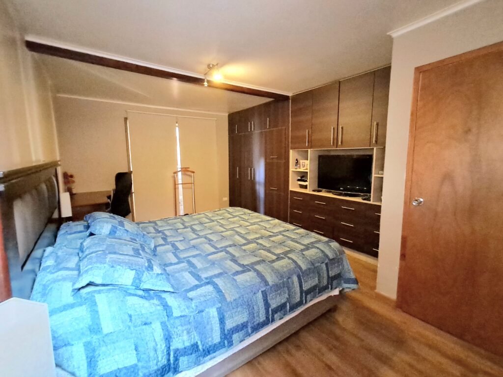 Cuenta con estacionamiento para dos vehículos, uno techado, más antejardín con reja, patio trasero y dos bodegas.