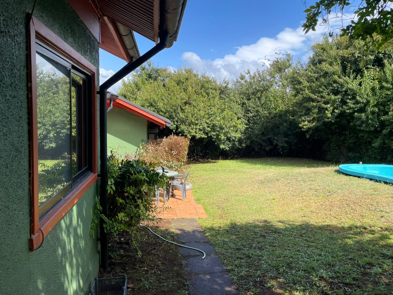 Amplio patio con piscina y estacionamiento.