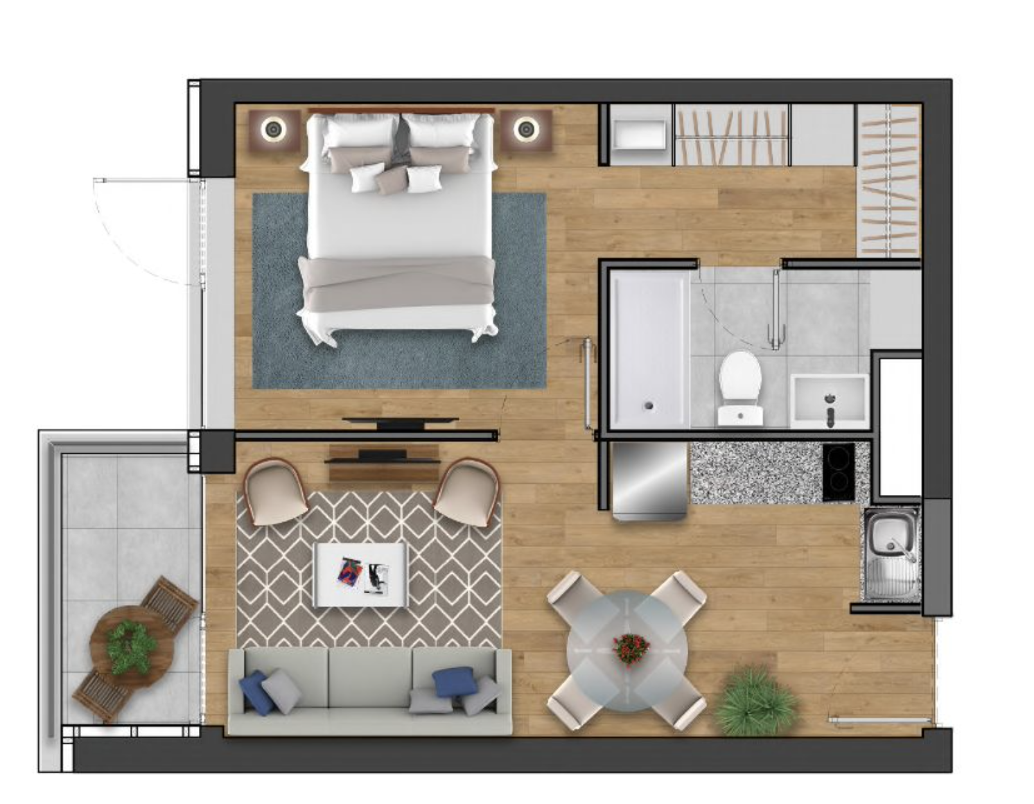 Consta de living comedor, cocina americana, un dormitorio, terraza.